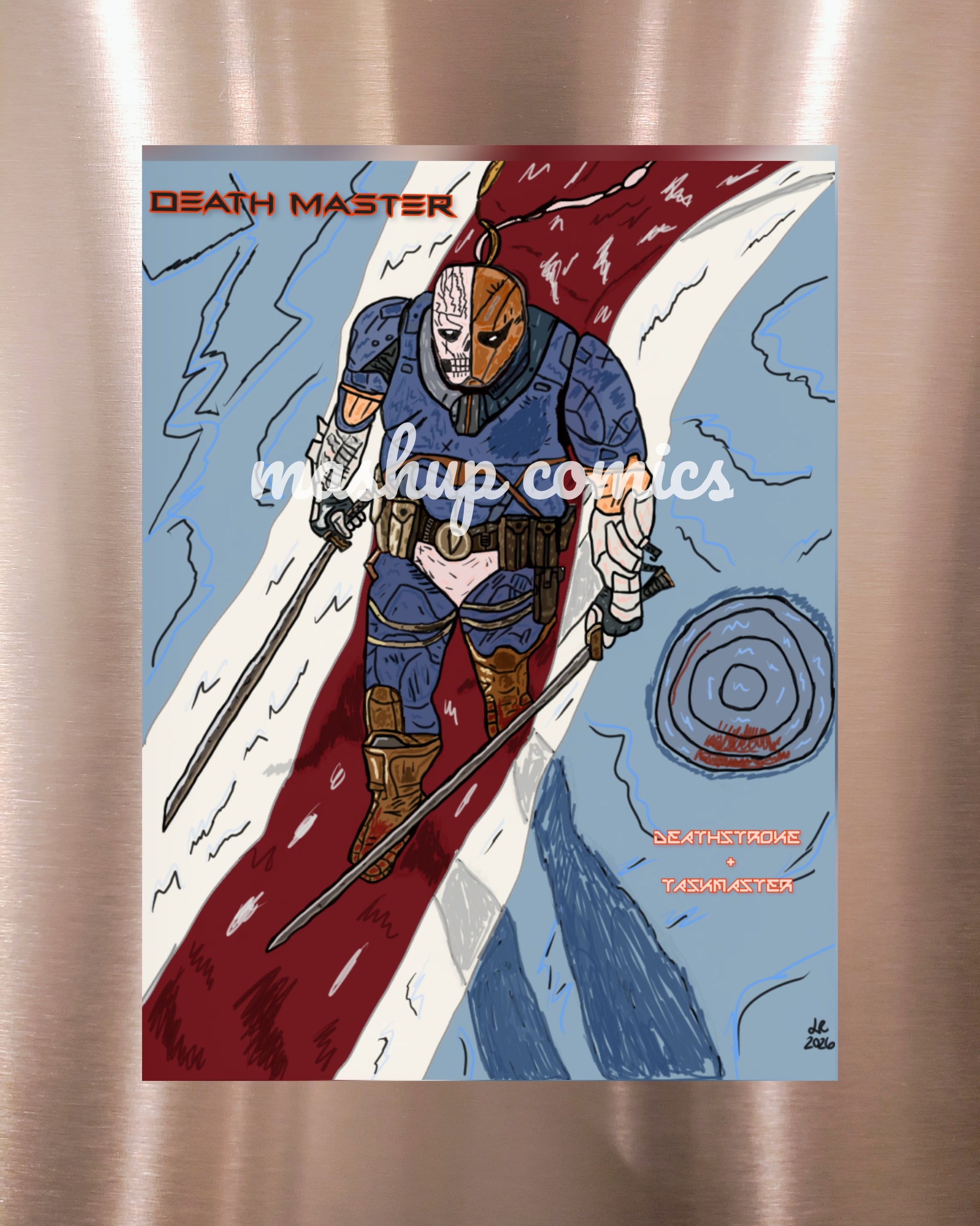 Death Master is a comic drawn mashup of Deathstroke from DC comics & Taskmaster from Marvel comics. Tony Wilson joined the U.S. Army by lying about his age. He mastered various combat styles & became a top soldier. He signed up for an experimental super soldier serum. Afterwards, his Strength & his senses were heightened but the government labeled it as a failure. Next, he became a mercenary for hire and would study all the superheroes moves. Eventually he became the Master of Death & became a villain for many of the heroes. All digital prints by Luke Roberts! All 8 x 10 Prints, Canvas Prints & Magnet Prints.