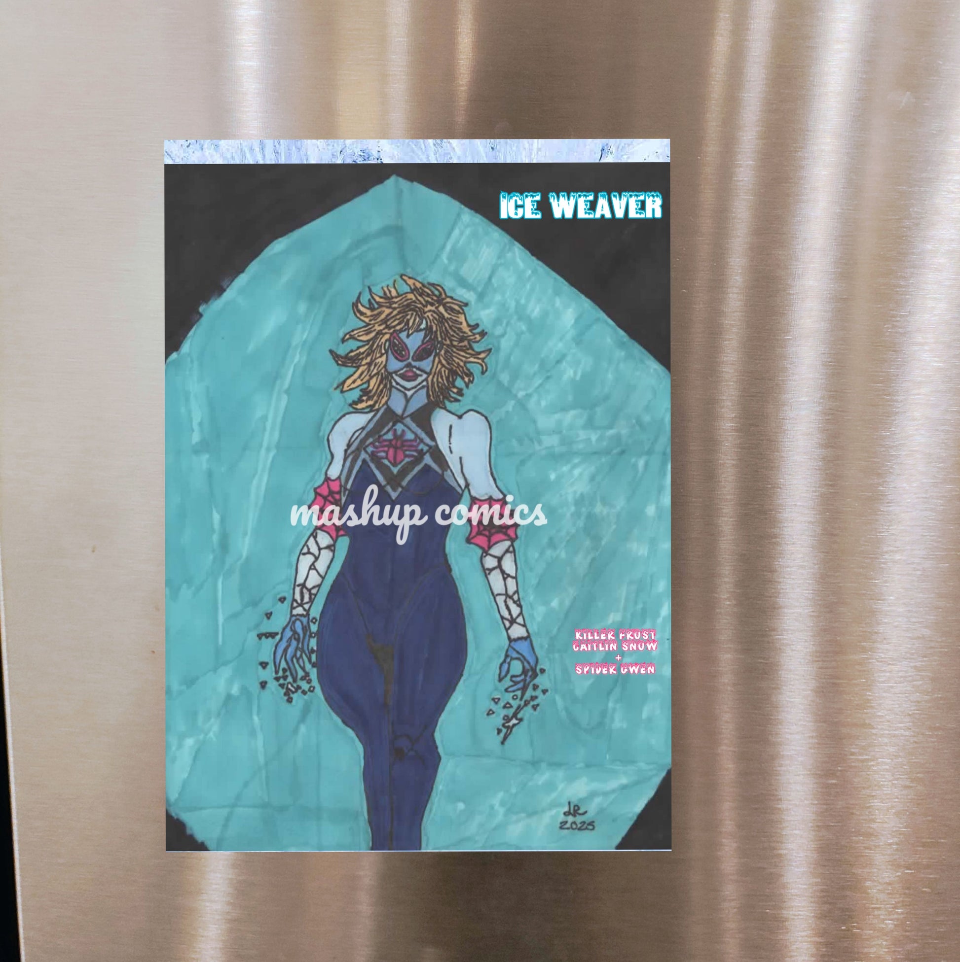 Ice Weaver is a comic drawn mashup of Killer Frost (Caitlin Snow) from DC Comics & Spider-Gwen from Marvel Comics. Gwen Snow is the daughter of a cop. In College, she was studying Winter & Spiders to become a scientist. While in College, she met Barry Parker & they became fast friends. After 2 years of College, they started dating. Eventually tragedy struck, & Gwen was killed by Speed Goblin. Until, her dead body was a test Subject. In which, she was bitten by thousands of genetically modified Arctic Wolf Spiders. She woke up with blue skin & ice based spider powers. Unfortunately, She accidentally killed the scientists that did this to her. Afterwards, Gwen became an Anti-hero by the name of Ice Weaver. Barry Parker (Spider Streak) is a mashup of Barry Allen Flash from DC Comics & Spider-man Peter Parker from Marvel Comics. Speed Goblin is a mashup of Reverse Flash from DC Comics and Green Goblin from Marvel Comics. All hand drawn prints by Luke Roberts! All 8 x 10 Prints, Canvas Prints & Magnet Prints.
